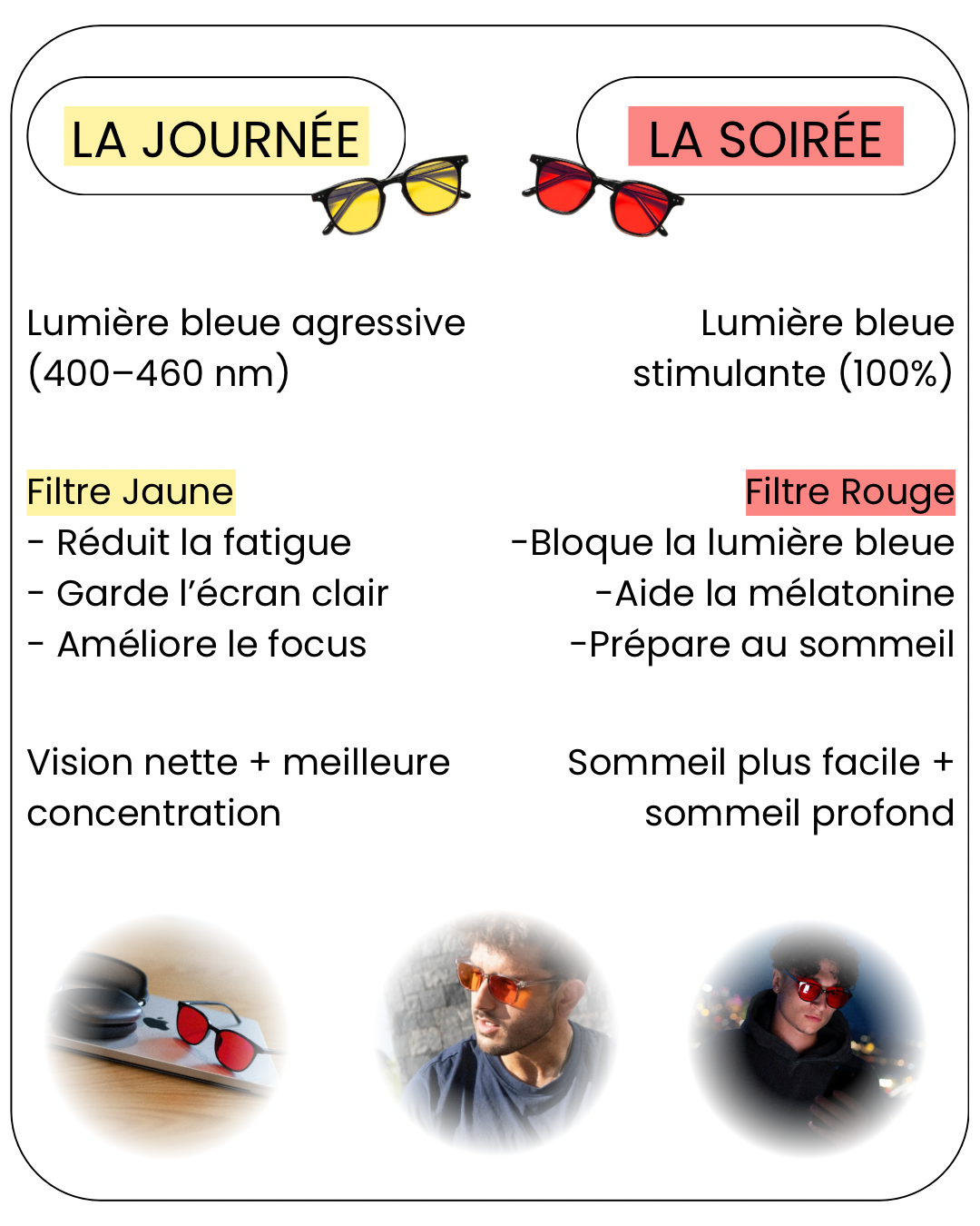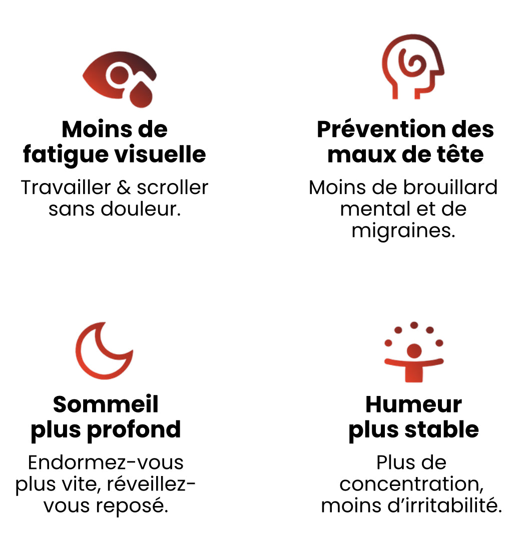 Protégez vos yeux et améliorez votre sommeil naturellement grâce à nos lunettes à verres rouges bloquant la lumière bleue.